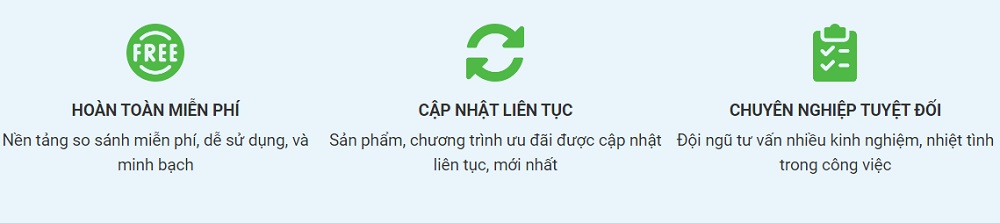 - Hoàn toàn miễn phí: Nền tảng so sánh miễn phí, dễ sử dụng, và minh bạch